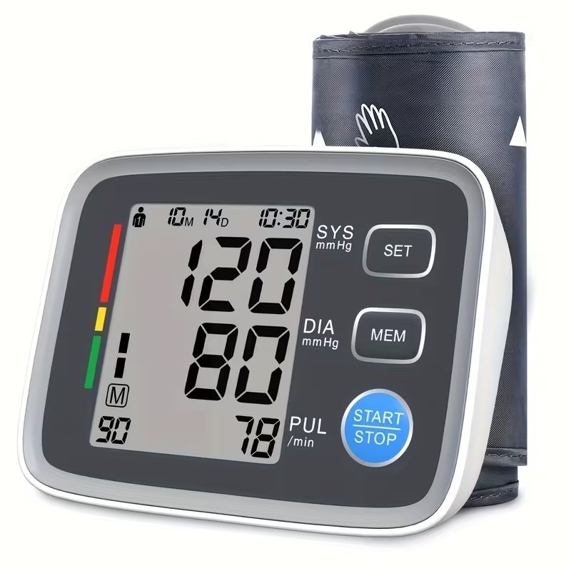 - Large, easy-to-read LCD display showing BP values, pulse, and time/date
