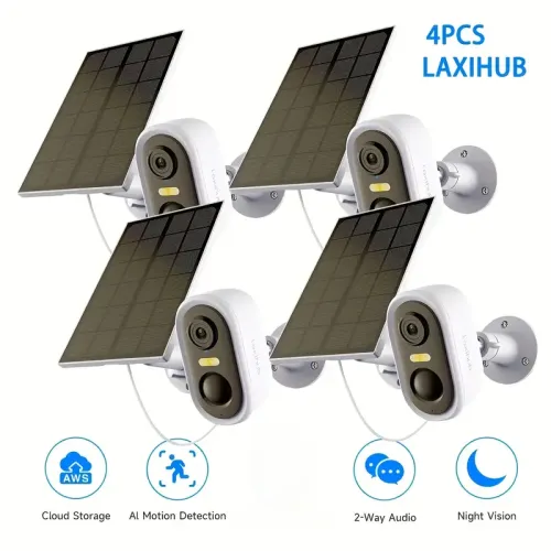 Secure your property with the 4pcs LaxiHub 1296P FHD Cameras. Featuring AI motion tracking, color night vision, and two-way audio for ultimate safety and convenience.